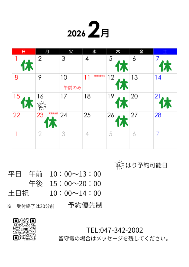 土日祝日も営業(※要カレンダー確認)し、働き世代の身体のメンテナンスや急な痛みも対応。健康に暮らしたいあなたをあたたかくお迎え致します。