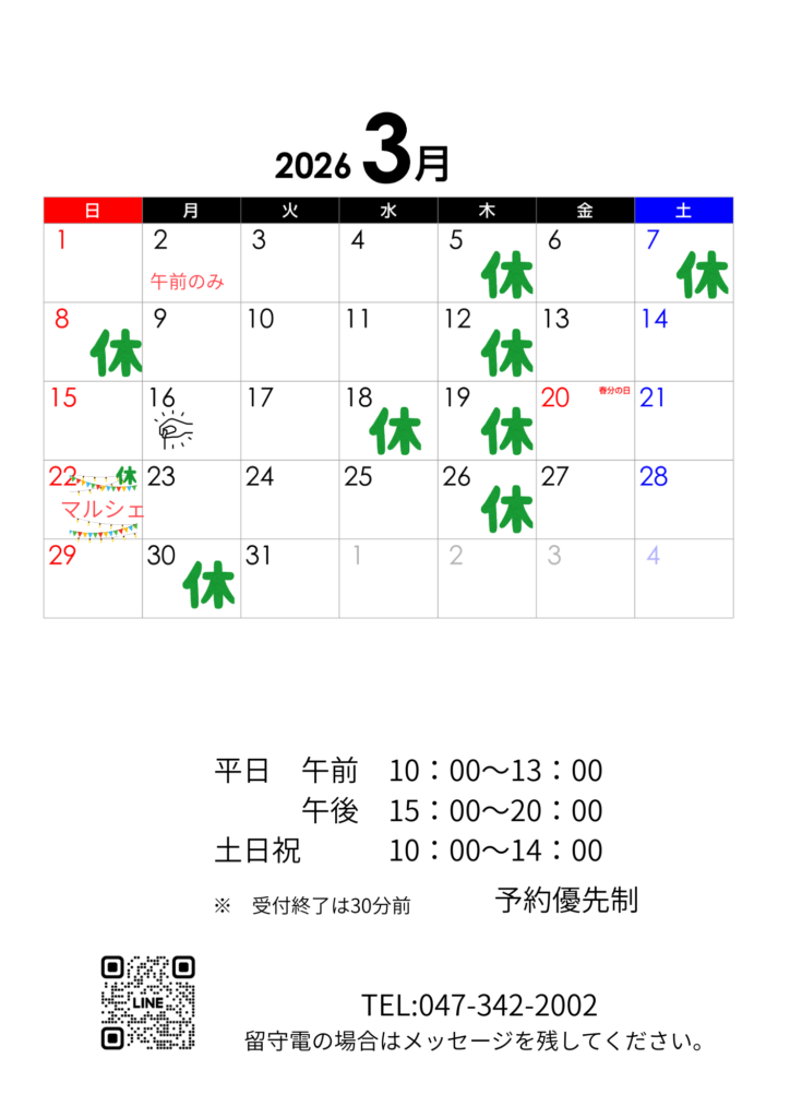 土日祝日も営業(※要カレンダー確認)し、働き世代の身体のメンテナンスや急な痛みも対応しています。